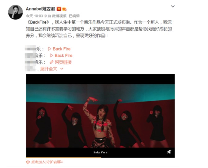 1月18日上午10点左右,华为二公主姚安娜在其个人社交平台官宣了自己出道后的首支音乐单曲V《ackFir》,并配文称,这是她人生中的第一个音乐作品,“作为一个新人,我深知自己还有许多需要学习的地方,大家鼓励与批评的声音都是帮助我更好成长的养分,我会继续沉淀自己,呈现更好的作品”。