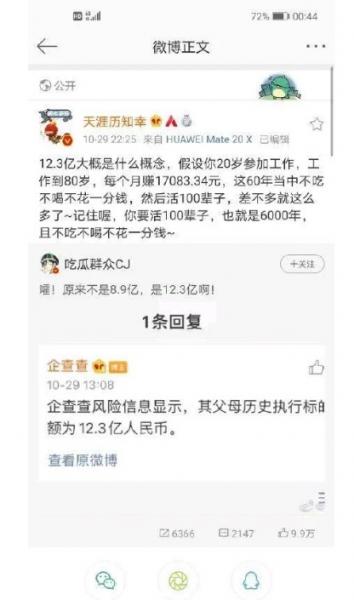 据企查查显示,周震南父亲周勇的公司,四川省简阳市大地生态发展有限公司目前经营风险信息为3条。周震南母亲杨后超公司,四川省乐至县天池藕粉有限责任公司的生产用房、工业用地、生产、办公用房也被选定评估,经办法院均为四川省资阳市中级人民法院。企查查风险信息显示,其父母历史执行标的总金额为12.3亿人民币。