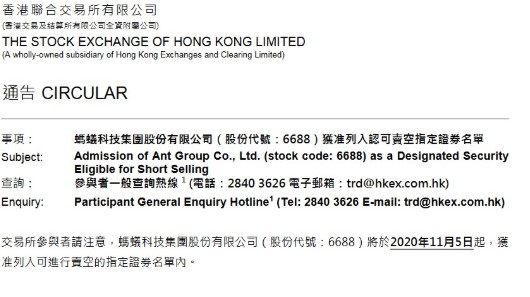 10月30日,港交所(00388)宣布,蚂蚁集团(06688)将于2020年11月5日起,获准列入可进行卖空的指定证券名单内。