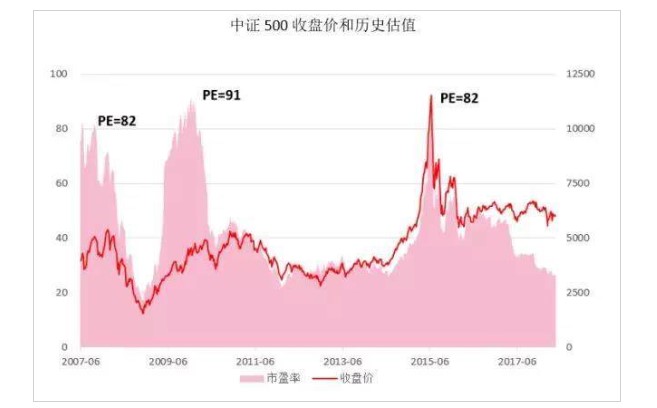 常用的估值指标一般包括、等,以市盈率为例,证券市场的行情走势与密切相关,牛市的普遍较高,而熊市较低,如果市场估值过高,或者已经接近历史高点,那么股市很有可能发生转折,下图为中证500指数点位及估值。 可以看到,历史上2007、2009和2015年的三波大牛市中,中证500的均呈现有规律的上涨