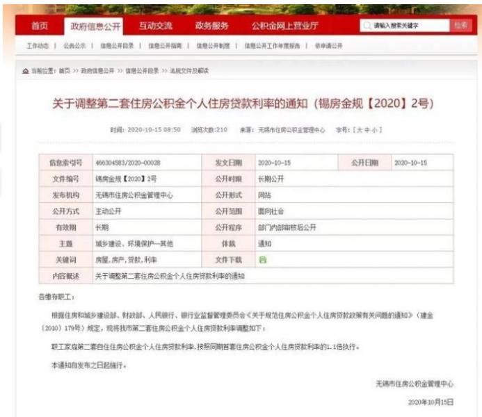 继节前常州出台二套房首付提高的政策之后,长三角又一三四线城市出台调控新政。10月15日上午,无锡市住房公积金管理中心官网发布《关于规范住房公积金个人住房贷款政策有关问题的通知》。其中提到:职工家庭第二套自住住房公积金个人住房贷款利率,按照同期首套住房公积金个人住房贷款利率的1.1倍执行。本通知自发布