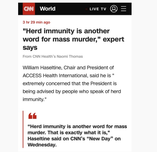 美国科学家威廉·哈兹尔廷于当地时间14日接受美国媒体采访时表示,对“群体免疫”的说法非常担心,并认为“群体免疫”是屠杀的另一种说法,这是无可争辩的事实,假如像特朗普政府所倡导的那样,如果用这种方式允许新冠病毒传播,美国每年都将有两百到六百万美国人死亡。哈兹尔廷认为,对美国而言,让政府中最高层的领