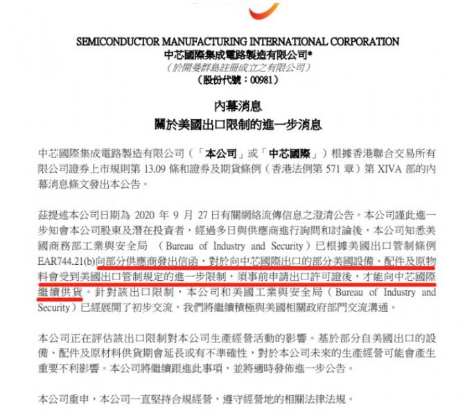 10月4日晚间,中芯国际对9月27日路透社报道的“中芯国际被美国拉入黑名单"再次进行回应,中芯国际在公告中表示,经过多日与供应商进行询问和讨论后,知悉美国商务部工业与安全局(urauofIdutryadcurity)已根据美国出口管制条例AR744.21()向部分供应商发出信函,对于向中芯国际出口的部分美国设备、配件及原