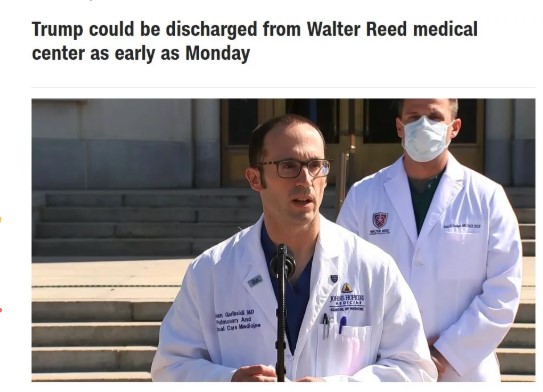 C刚刚消息,美东时间4日上午,由白宫医生肖恩·康利(aColy)领导的医疗团队在沃尔特·里德医疗中心召开第二次发布会,通报了特朗普最新状况。康利说,特朗普总统病情在“持续好转”,但就像所有疾病一样,总会有些反反复复。 医疗队成员布莱恩·加里波迪(riaGarialdi)医生表示,总统最早可能
