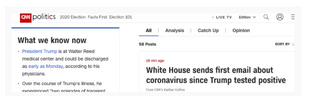 “特朗普总统周一(10月5日)的日程上没有任何活动,因为他仍继续在沃尔特·里德医疗中心住院治疗。”刚刚,美国有线电视新闻网(C)报道了白宫最新公布的这一消息。 4日早些时候,特朗普医疗团队成员布莱恩·加里波第博士表示,特朗普最早可能在周一从沃尔特·里德出院。加里波第说,特朗普在周六接受了第二