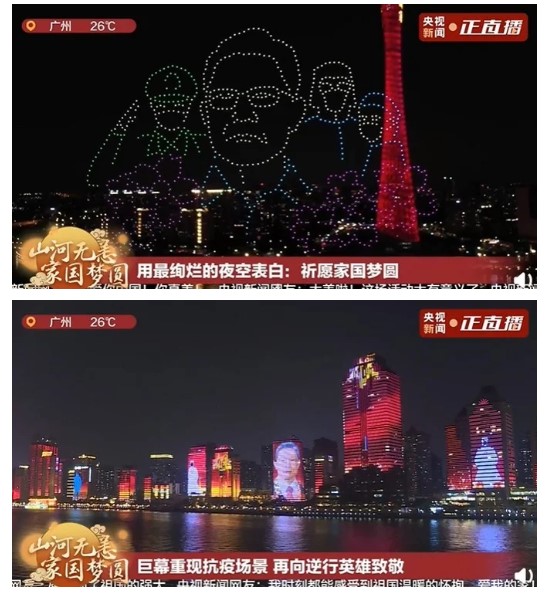 昨晚,全国31省区市上演灯光秀。在广东,珠江畔灯火璀璨,巨幕上重现抗疫场景,向逆行英雄致敬;千架***编队在夜空中组成钟南山等抗疫者肖像,拼出“万家团圆”“祝福祖国”等字样。传递视频,祝愿祖国安宁,祝愿万家团圆!