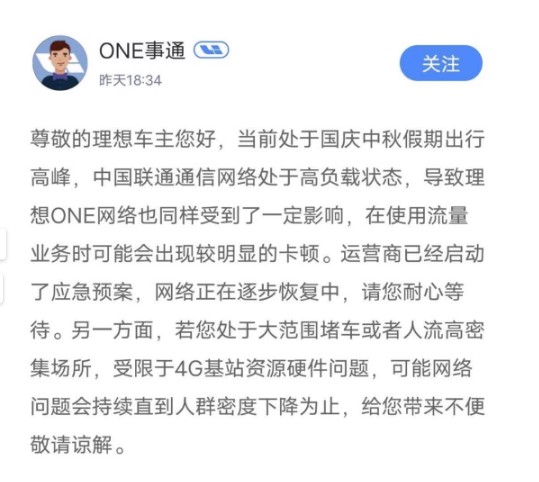 昨日,理想汽车“O事通”发文称,因处于国庆中秋假期出行高峰,中国联通通信网络处于高负载状态,导致理想O网络也同样受到了一定影响,在使用流量业务时可能会出现较明显的卡顿。运营商已经启动了应急预案,网络正在逐步恢复中。 理想汽车表示,若用户处于大范围堵车或者人流高密集场所,受限于4G基站资源