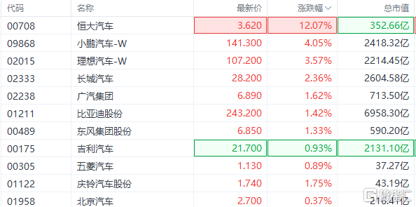 港股汽车股集体走高,恒大汽车(0708.HK)拉升涨超12%,小鹏汽车(9868.HK)涨超4%,理想汽车(2015.HK)涨超3%,长城汽车(2333.HK)、广汽集团(2238.HK)、比亚迪股份(1211.HK)等跟涨。 国庆假期期间,在多地举办的车展及汽车销售网点,新能源汽车表现尤为抢眼,带动车市消费继续呈现上扬态势。中国贸促