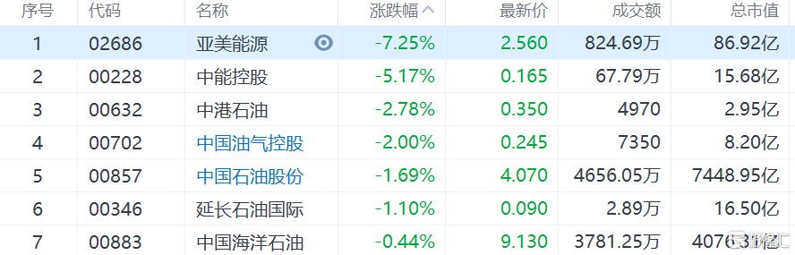 油气股普跌,亚美能源跌逾7%,中能控股跌逾5%,三桶油方面,中石油跌1.69%,中海油跌0.44%。 隔夜,欧洲天然气期货走势“过山车”,TTF基准荷兰天然气期货欧市尾盘跌11%,报104.9欧元/兆瓦时。原本处于2008年金融危机以来最高位的美国天然气也回吐2%以上的日内涨幅,收跌超10%,报5.6750美元/百万英热单