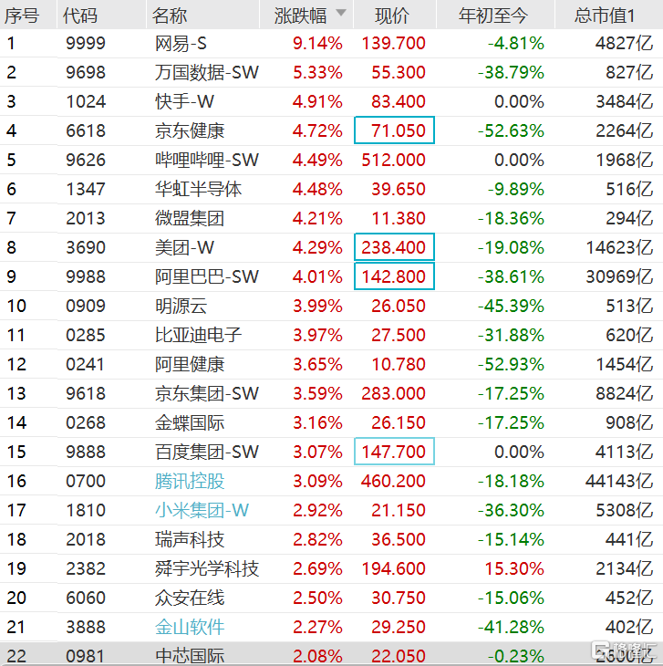 港股科技股集体走强,恒生科技指数大涨近3%。其中,网易-(9999.HK)跳空上涨超9%报139.9港元,领涨恒生科技指数。隔夜美股网易(T.U)收涨6.65%报88.71美元,折算成港股市场价格为138.535港元/股。