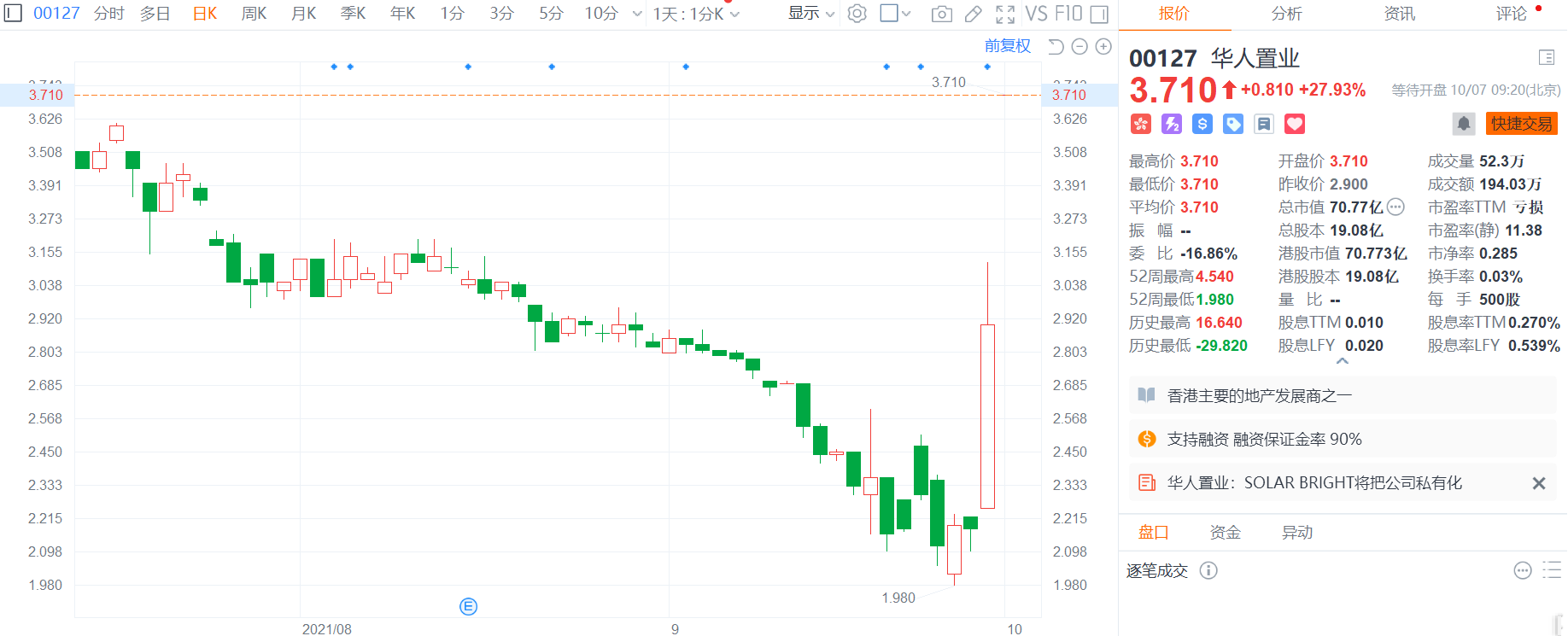 华人置业(0127.HK)复牌大幅高开近28%,报3.71港元,股价刷新逾三个月,总市值71亿港元。 华人置业昨日公告,要约人olarrightLtd及公司联合公布,于2021年9月28日,要约人olarrightLtd要求董事会向计划股东提呈根据公司法第99条透过计划方案将公司私有化该建议。根据该计划,倘该计划生效,则计划股