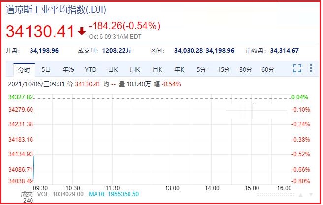 美股三大指数集体低开,道指跌0.77%,纳指跌0.98%,标普500指数跌0.83%。大型科技股普跌,苹果、微软、阿里巴巴跌超1%。 1、截止发稿时间,道琼斯报于:34151.31,成交量:1267.78万 2、美股快报:自9月以来,美股市场突然踩下了刹车。标普500一个月大跌4.8%,创下2020年3月以来最差的单月表现