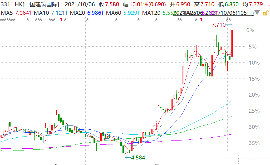 香港地产股走强之际,在香港从事建筑业务的中国建筑国际(3311.HK)午后随之拉升一度涨近12%至7.71港元,股价创2018年8月以来新高,市值388亿港元。 港府发布施政报告,市场重点关注土地政策。施政报告中提到:未来香港将兴建33万套公屋;增建过渡性房屋,未来数年供应增至2万个;研究降低强拍门槛,加快