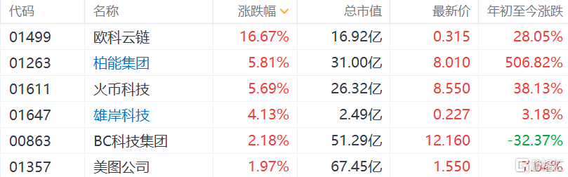 港股区块链概念股集体上涨,其中,欧科云链涨超16%领涨,柏能集团和火币科技涨超5%,雄岸科技涨超4%,C科技集团涨超2%,美图公司涨近2%。