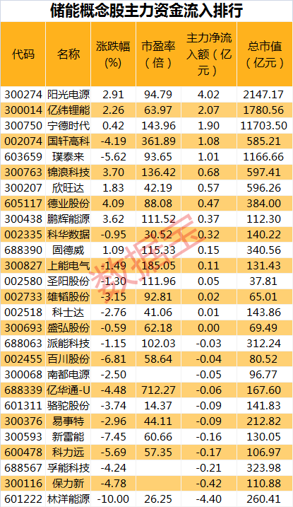 数据统计,A股中储能概念股合计有27只。昨日大盘整体处于劣势,仍有部分储能概念股维持上涨,德业股份涨4.09%,锦浪科技、鹏辉能源、阳光电源涨幅居前,分别上涨3.7%、3.62%、2.91%。另外,从主力资金流向来看,阳光电源获得主力资金的青睐,全天净流入4.02亿元,亿纬锂能、宁德时代、国轩高科、璞泰来主力资金净流入