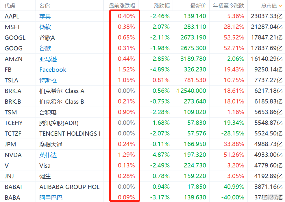 扭转昨日跌势,美股大型科技股盘前普涨。其中,苹果涨0.4%,微软涨0.38%,谷歌A涨0.65%,谷歌涨0.31%,亚马逊涨0.44%,Facook涨1.52%,特斯拉涨1%。