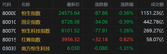 港股三大指数集体收跌,节前市场交易相对平淡。恒指午后近乎翻红,收跌0.36%报24575点,国指跌0.39%报8726点,恒生科技指数跌1.26%报6101点。 盘面上,大型科技股普跌,阿里巴巴跌超4%,京东跌3.6%,小米、百度、快手皆跌超1%;恒大概念股未能延续昨日反弹,恒大汽车跌近10%,昨日暴涨44%;纸业股跌势不