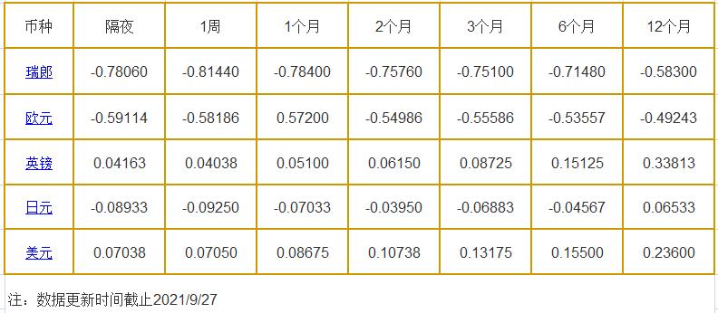 9月27日伦敦银行同业拆借利率: 隔夜LIOR:瑞郎报-0.78060%,欧元报-0.59114%,英镑报0.04163%,日元报-0.08933%,美元报0.07038%; 1周LIOR:瑞郎报-0.81440%,欧元报-0.58186%,英镑报0.04038%,日元报-0.09250%,美元报0.07050%; 1个月LIOR:瑞郎报-0.78400%,欧元报-0.57200%,英镑报0.051