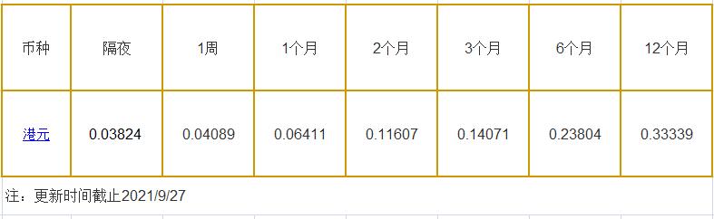 9月27日香港银行间同业拆借利率港币: 隔夜报0.03824%, 1周期报0.04089%, 1月期报0.06411%, 12月期报0.33339%。 香港银行同业拆放利率HIOR(HogkogItrakOffrdRat),指香港货币市场上,银行与银行之间的一年期以下的短期资金借贷利率,是从伦敦同业拆借利率(LIOR)