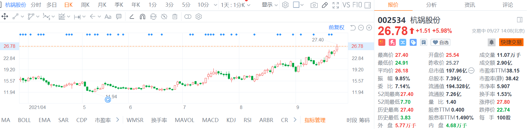 杭锅股份(002534.Z)股价继续走强,盘中最高见27.4元再创新高,现报26.78元,涨幅5.98%,最新总市值197.96亿,年内累计涨幅超200%。 中航证券指,考虑到杭锅股份余热锅炉的龙头地位以及未来光热储能的先发优势,给予杭锅股份2022年25倍,对应股价为32.55元,首次覆盖,给予“买入”评级。