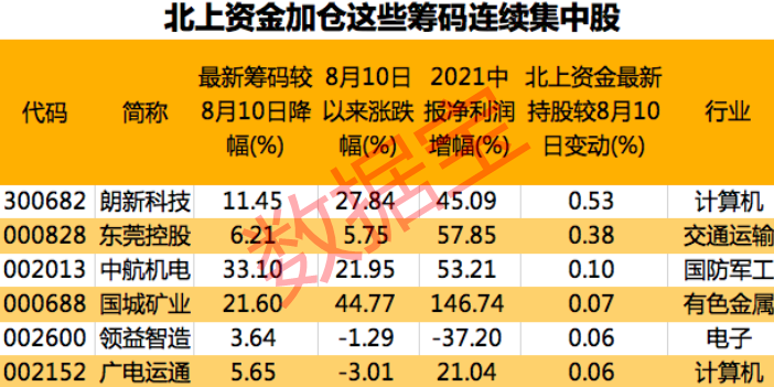 数据统计显示,上述34股中,北上资金最新持股较8月10日增仓的个股仅有6只,包括朗新科技、东莞控股、中航机电等。 朗新科技最新持股4.76%,较8月10日增仓0.53个百分点,公司专注于电力及能源行业业务信息化系统的技术与服务提供商,受益于绿色电力板块利好,公司在最新收盘日股价大涨6.6%,公司上半年净利润同
