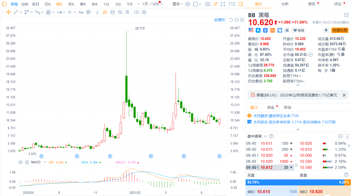 黑莓(.U)涨幅扩大至11.09%,现报10.62美元,暂成交6373.58万美元,最新总市值为60.21亿美元。 黑莓Q2营收从去年同期的2.59亿美元降至1.75亿美元,但超过了分析师预期的1.635亿美元。黑莓二季度净亏损为1.44亿美元,上年同期净亏损为2300万美元摊薄后每股亏损0.25美元,上年同期每股亏损为0.04美元。