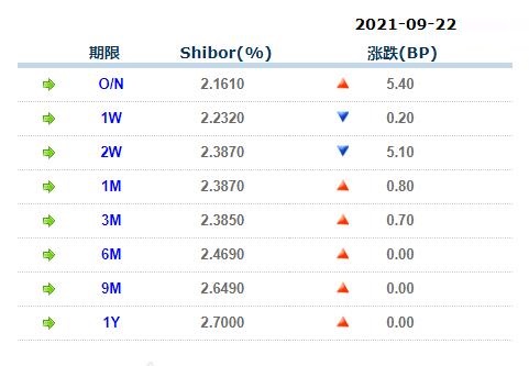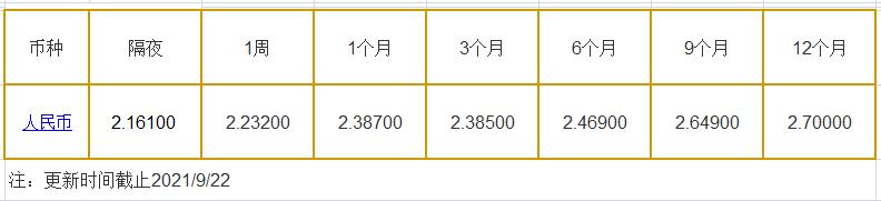 9月22日中国银行间同业拆借利率人民币: 隔夜报2.16100%, 1周期报2.23200%, 1月期报2.38700%, 12月期报2.70000%。 中国银行同业拆放利率(ChiaItrakOffrdRat,简称CHIOR)。同业拆借利率指金融机构同业之间的短期资金借贷利率。它有两个利率,拆进利率表示金融机构
