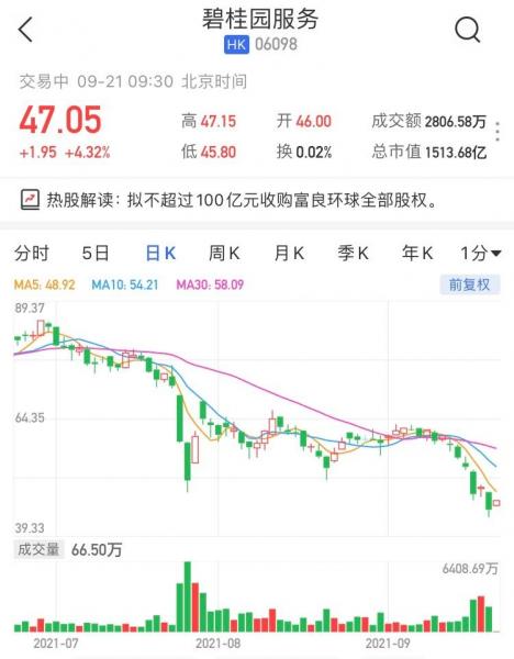 碧桂园服务(6098.HK)高开高走,现报47.05港元,涨4.32%,暂成交2806万港元,最新市值1513亿港元。 碧桂园服务昨日晚间发公告称,9月20日(交易时段结束后),碧桂园物业香港(公司间接全资附属公司)与富力物业签订股权转让协议,据此,集团同意以不超过人民币100亿元的代价收购富良环球,由此间接收购富良