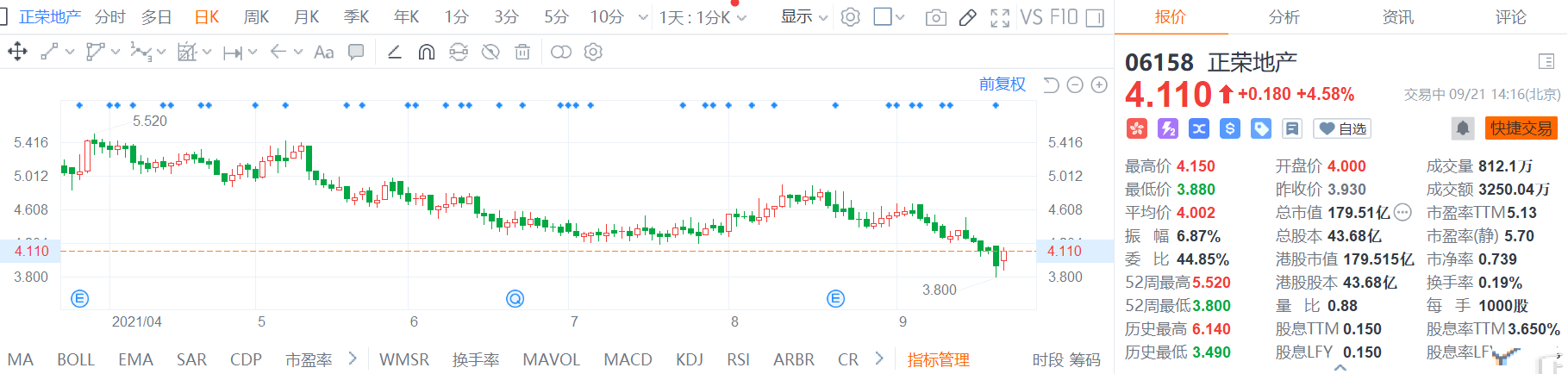正荣地产(6158.HK)股价快速拉升,现报4.11港元,涨幅4.58%,最新总市值179.5亿港元。 公司控股股东RoYu于9月20日在公开市场以平均每股约3.93港元的价格购买公司合共200万股普通股。收购后,其所持公司股份增至22.805亿股,占公告日期公司已发行股本总数约52.21%。