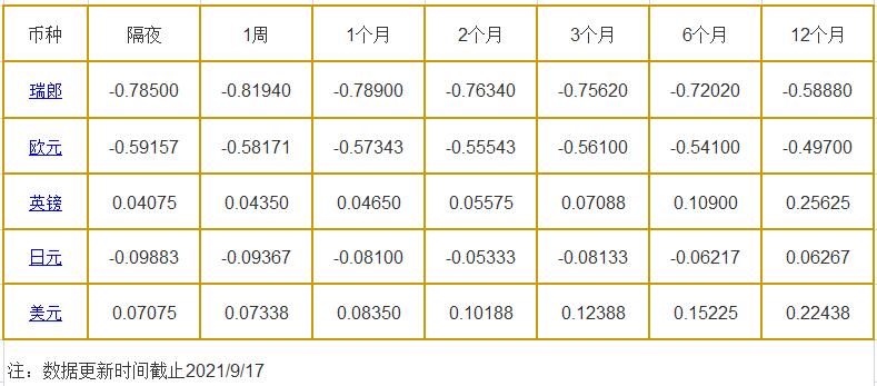 9月17日伦敦银行同业拆借利率: 隔夜LIOR:瑞郎报-0.78500%,欧元报-0.59157%,英镑报0.04075%,日元报-0.09883%,美元报0.07075%; 1周LIOR:瑞郎报-0.81940%,欧元报-0.58171%,英镑报0.04350%,日元报-0.09367%,美元报0.07338%; 1个月LIOR:瑞郎报-0.78900%,欧元报-0.57343%,英镑报0.046