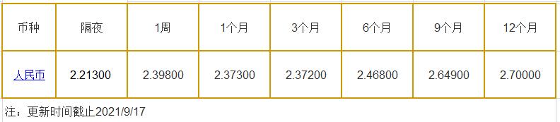 9月17日中国银行间同业拆借利率人民币: 隔夜报2.21300%, 1周期报2.39800%, 1月期报2.37300%, 12月期报2.69900%。 中国银行同业拆放利率(ChiaItrakOffrdRat,简称CHIOR)。同业拆借利率指金融机构同业之间的短期资金借贷利率。它有两个利率,拆进利率表示金融机构