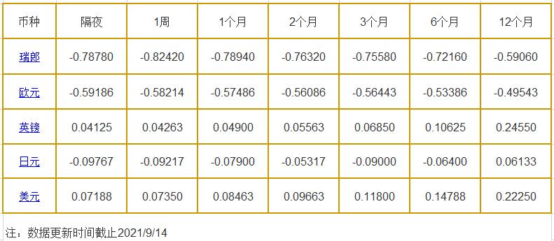 9月14日伦敦银行同业拆借利率: 隔夜LIOR:瑞郎报-0.78780%,欧元报-0.59186%,英镑报0.04125%,日元报-0.09767%,美元报0.07188%; 1周LIOR:瑞郎报-0.82420%,欧元报-0.58214%,英镑报0.04263%,日元报-0.09217%,美元报0.07350%; 1个月LIOR:瑞郎报-0.78940%,欧元报-0.57486%,英镑报0.049
