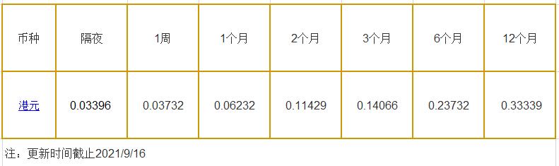 9月16日香港银行间同业拆借利率港币: 隔夜报0.03396%, 1周期报0.03732%, 1月期报0.06232%, 12月期报0.33339%。 香港银行同业拆放利率HIOR(HogkogItrakOffrdRat),指香港货币市场上,银行与银行之间的一年期以下的短期资金借贷利率,是从伦敦同业拆借利率(LIOR)