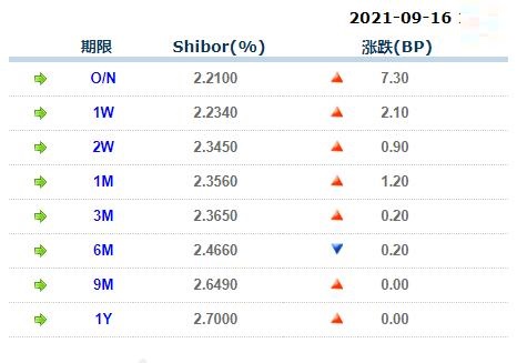 9月16日中国银行间同业拆借利率人民币: 隔夜报2.21000%, 1周期报2.23400%, 1月期报2.35600%, 12月期报2.69900%。 中国银行同业拆放利率(ChiaItrakOffrdRat,简称CHIOR)。同业拆借利率指金融机构同业之间的短期资金借贷利率。它有两个利率,拆进利率表示金融机构