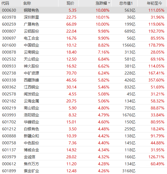 有色金属板块走强,铜陵有色、云铝股份、广晟有色等多股涨停,中国铝业大涨近9%,云南铜业、天山铝业、火神股份、江西铜业等跟涨。港股方面,中国铝业涨超10%,五矿资源涨近8%,洛阳钼业涨近6%。 中信证券研报指出,在前期供需双弱的格局向着供需缺口扩大的局面改变的背景下,成本的抬升进一步夯实价格