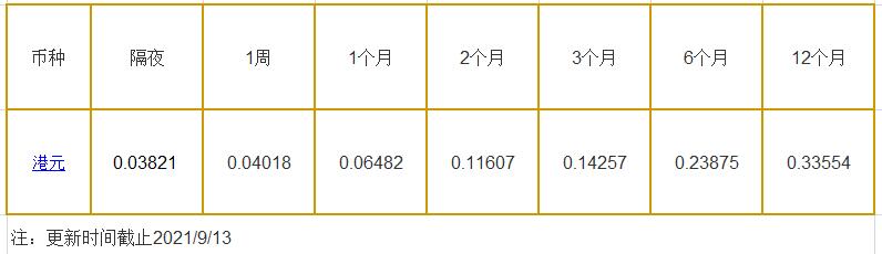 9月13日香港银行间同业拆借利率港币: 隔夜报0.03821%, 1周期报0.04018%, 1月期报0.06482%, 12月期报0.33554%。 香港银行同业拆放利率HIOR(HogkogItrakOffrdRat),指香港货币市场上,银行与银行之间的一年期以下的短期资金借贷利率,是从伦敦同业拆借利率(LIOR)