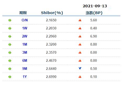 9月13日中国银行间同业拆借利率人民币: 隔夜报2.16500%, 1周期报2.20300%, 1月期报2.32000%, 12月期报2.69900%。 中国银行同业拆放利率(ChiaItrakOffrdRat,简称CHIOR)。同业拆借利率指金融机构同业之间的短期资金借贷利率。它有两个利率,拆进利率表示金融机构