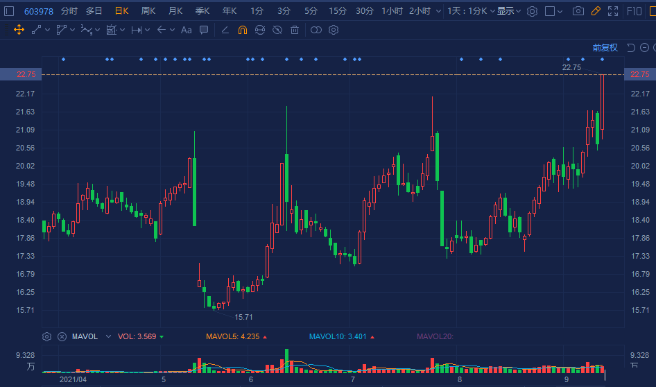 深圳新星(603978.H)快速拉升至涨停板,报22.75元创一年新高价,总市值36.4亿元。 深圳新星12日公布,截至2021年9月9日,公司此次回购股份期限届满,已实际回购公司股份188.49万股,占公司总股本的1.18%,,使用资金总额3500.29万元(不含交易费)。公司回购金额已超过回购方案中回购金额的下限。