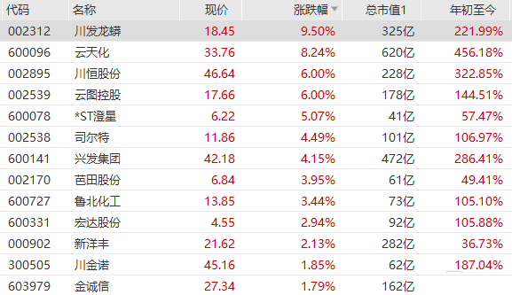 磷化工板块延续强势,川发龙蟒大涨超9%,云天化涨超8%,川恒股份、云图控股涨6%,司尔特、兴发集团、芭田股份等跟涨。今年以来,云图控股、新洋丰、川金诺等磷化工企业加紧布局磷酸铁项目,拥有3.5亿余吨磷矿资源的川恒股份便是最近的入局者。 海通证券表示,磷化工企业进军磷酸铁锂优势显著,具有工业