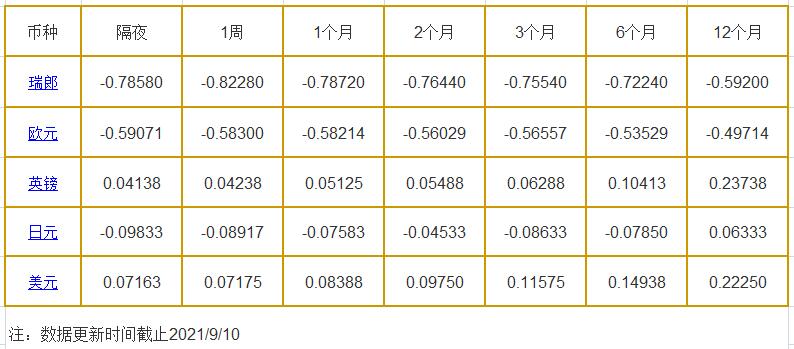 9月10日伦敦银行同业拆借利率: 隔夜LIOR:瑞郎报-0.78580%,欧元报-0.59071%,英镑报0.04138%,日元报-0.09833%,美元报0.07163%; 1周LIOR:瑞郎报-0.82280%,欧元报-0.58300%,英镑报0.04238%,日元报-0.08917%,美元报0.07175%; 1个月LIOR:瑞郎报-0.78720%,欧元报-0.58214%,英镑报0.051