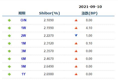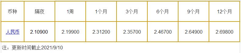9月10日中国银行间同业拆借利率人民币: 隔夜报2.10900%, 1周期报2.19900%, 1月期报2.31200%, 12月期报2.69800%。 中国银行同业拆放利率(ChiaItrakOffrdRat,简称CHIOR)。同业拆借利率指金融机构同业之间的短期资金借贷利率。它有两个利率,拆进利率表示金融机构