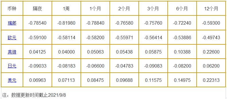 9月8日伦敦银行同业拆借利率: 隔夜LIOR:瑞郎报-0.78540%,欧元报-0.59100%,英镑报0.04125%,日元报-0.09033%,美元报0.06963%; 1周LIOR:瑞郎报-0.81980%,欧元报-0.58114%,英镑报0.04000%,日元报-0.08183%,美元报0.07113%; 1个月LIOR:瑞郎报-0.78840%,欧元报-0.58200%,英镑报0.0506