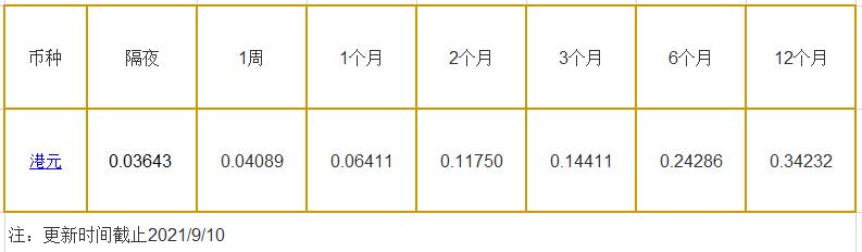 9月10日香港银行间同业拆借利率港币: 隔夜报0.03643%, 1周期报0.04089%, 1月期报0.06411%, 12月期报0.35125%。 香港银行同业拆放利率HIOR(HogkogItrakOffrdRat),指香港货币市场上,银行与银行之间的一年期以下的短期资金借贷利率,是从伦敦同业拆借利率(LIOR)