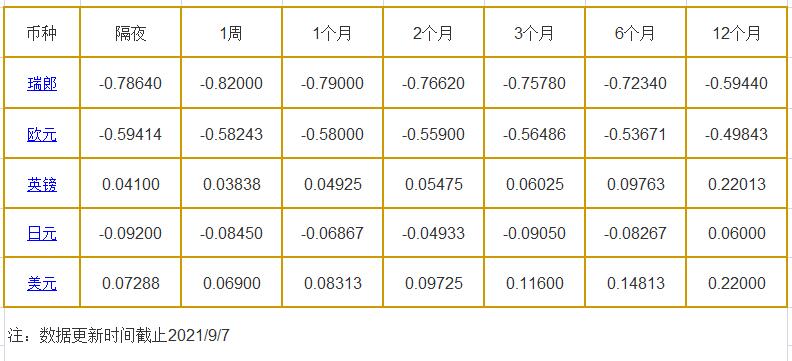 9月7日伦敦银行同业拆借利率: 隔夜LIOR:瑞郎报-0.78640%,欧元报-0.59414%,英镑报0.04100%,日元报-0.09200%,美元报0.07288%; 1周LIOR:瑞郎报-0.82000%,欧元报-0.58243%,英镑报0.03838%,日元报-0.08450%,美元报0.06900%; 1个月LIOR:瑞郎报-0.79000%,欧元报-0.58000%,英镑报0.0492