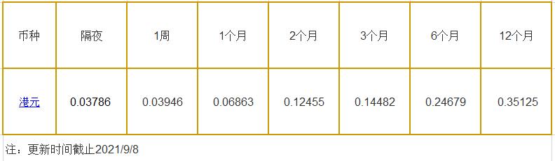 9月8日香港银行间同业拆借利率港币: 隔夜报0.03786%, 1周期报0.03946%, 1月期报0.06863%, 12月期报0.35125%。 香港银行同业拆放利率HIOR(HogkogItrakOffrdRat),指香港货币市场上,银行与银行之间的一年期以下的短期资金借贷利率,是从伦敦同业拆借利率(LIOR)变