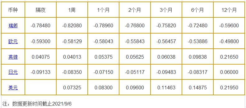 9月6日伦敦银行同业拆借利率: 隔夜LIOR:瑞郎报-0.78480%,欧元报-0.59300%,英镑报0.04075%,日元报-0.09133%,美元报%; 1周LIOR:瑞郎报-0.82080%,欧元报-0.58129%,英镑报0.04013%,日元报-0.08350%,美元报0.07325%; 1个月LIOR:瑞郎报-0.78960%,欧元报-0.58043%,英镑报0.05375%,日