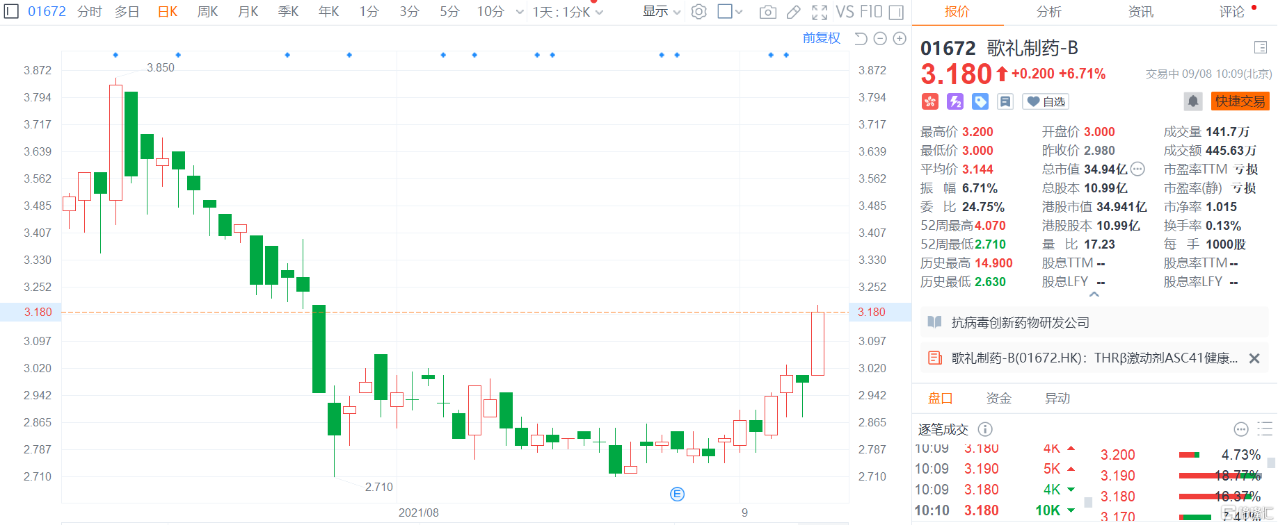 歌礼制药-(1672.HK)涨6.71%,报3.18港元,股价创一个半月以来新高,最新总市值35亿港元。 歌礼制药-发布公告,公司全资附属甘莱制药有限公司的肝脏靶向性前体药物AC41口服片剂健康受试者药物相互作用和非酒精性脂肪性肝病(AFLD)患者药代动力学(K)美国I期临床试验取得良好顶线数据。AC41主要通过CY