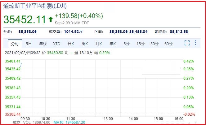 美股小幅高开,道指涨0.36%,纳指涨0.32%,标普500指数涨0.33%。阿里巴巴涨近3%,阿里巴巴集团将在2025年前累计投入1000亿元,助力共同富裕。晶科能源涨超4%,公司此前宣布与宁德时代达成战略合作。 1、截止发稿时间,道琼斯报于:35445.99,成交量:1251.49万 2、美股快报:美国劳工部将于周五公
