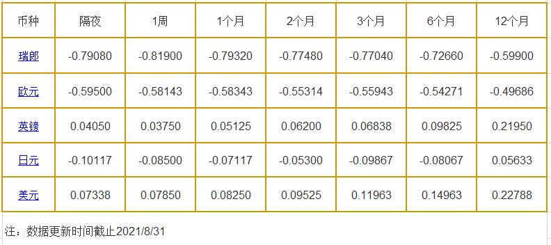 8月31日伦敦银行同业拆借利率: 隔夜LIOR:瑞郎报-0.79080%,欧元报-0.59500%,英镑报0.04050%,日元报-0.10117%,美元报0.07338%; 1周LIOR:瑞郎报-0.81900%,欧元报-0.58143%,英镑报0.03750%,日元报-0.08500%,美元报0.07850%; 1个月LIOR:瑞郎报-0.79320%,欧元报-0.58343%,英镑报0.051