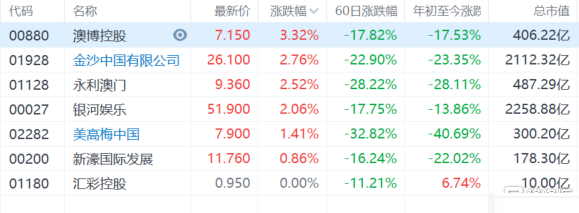濠赌股继续走强,澳博控股(0880.HK)涨超3%,金沙中国、永利澳门、银河娱乐均涨超2%。 澳门**监察协调局昨日午间公布,澳门8月份幸运**毛收入44.42亿澳门元,同比增长234%,高于预估的176%。澳门1-8月份幸运**毛收入619亿澳门元,同比增长70.1%。大摩最新发研报指,估计澳门9月赌收按月回升64%至71亿澳门